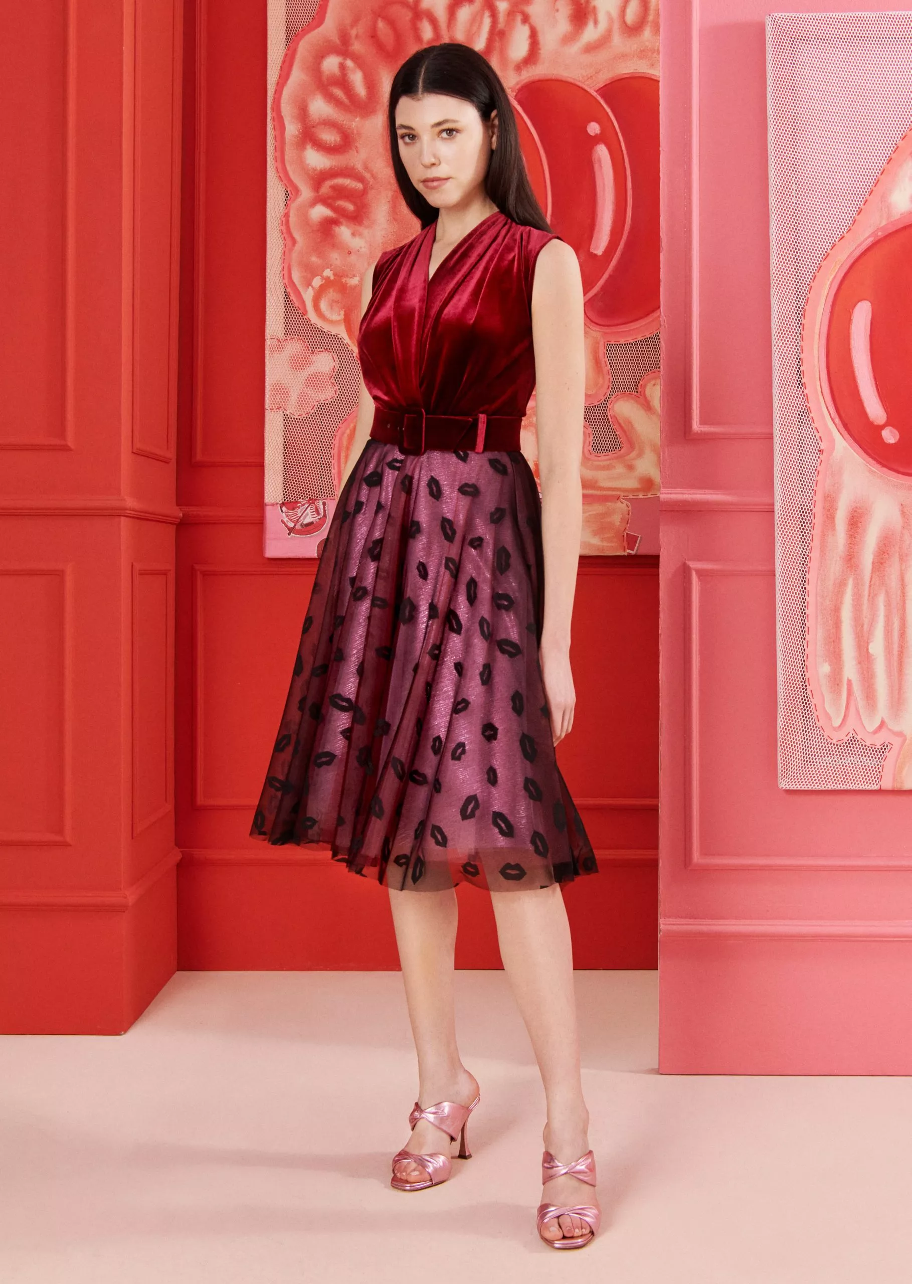 Hochwertige Baumwoll-T-Shirts mit Druckmotiven der beiden Künstler werden zu romantischen Tüllröcken kombiniert, in den ein „Kissing Cousins“-Schmollmund – ein Markenzeichen von Mehmet & Kazim – eingewebt wurde. Ergänzt wird die Kollektion durch Basics wie Jumpsuits, Tops, Hosen und Kleider aus opulentem venezianischem Samt.