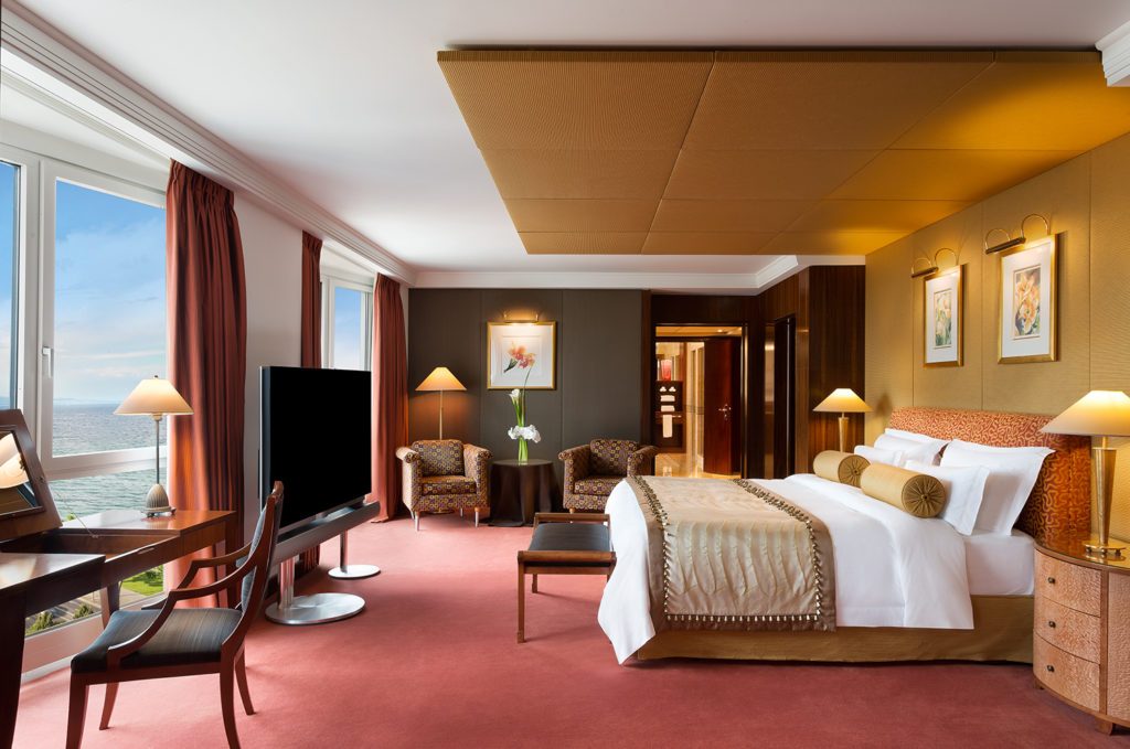 Wer hier Gast ist, der darf sich auf über 1.680qm Luxus freuen. Damit ist die Royal Penthouse Suite nicht nur eine der teuersten, sondern auch größten Hotel Suiten der Welt. Die Suite nimmt damit den gesamten 8. Stock des Luxus Hotels am See ein und wartet mit 12 Zimmern und jeweils eigenem Bad en suite auf. Regendusche und Pflegeprodukte von Hermès inklusive. Genügend Platz also für eine große Entourage.