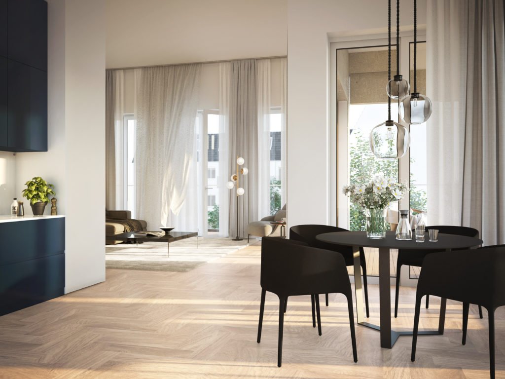 Die umlaufende Terrassengalerie und die große Rooftop-Terrasse laden zum Grillen mit Freunden und zum ganz privaten Sonnenbaden ein – perfekt, sollte es weiterhin Reisebeschränkungen geben. Das Herzstück ist der der offene Wohn-, Koch- und Essbereich. Das gesamte Gebäude bietet eine edle Ausstattung mit bodentiefen Fenstern, Eichenholzdielen mit Fußbodenheizung, hohen Decken sowie schönen Design-Bädern. Ein modernes Smart-Home-System, Terrasse oder Balkon mit Süd-Ausrichtung sind ebenfalls in den Einheiten geboten.