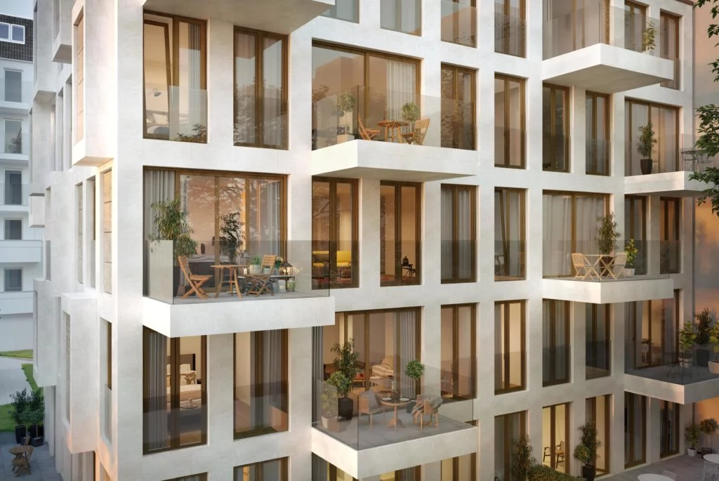 The OYSTER in Berlin-Charlottenburg bietet brandneue, sehr luxuriöse Wohneinheiten, die mit ungewöhnlicher Architektur von Heim Balp Architekten gestaltet werden. Die gestaffelten Fassadenelemente erinnern an Austernschalen. Travertin Naturstein und nachhaltige Holzlamellen werden hier verbaut.
