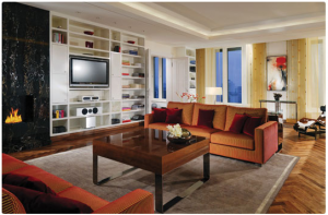 Wer im großzügigen Wohnzimmer auf den großzügigen Sofas nicht recht entspannen kann, hat die Möglichkeit auf eine Sauna oder ein Wannenbad mit Whirlpoolfunktion zurückzugreifen. Für die Fitness wurde im Ankleidezimmer als Trainingsgerät ein Kinesis Personal von Technogym verbaut und auf Wunsch kann auch ein Fitnesstrainer ein individuelles Workout für den Gast anbieten. Es bleibt aber verwunderlich, warum dieses Gerät in der Ankleide verbaut wurde, denn wer will schon neben seinen Schuhen und Anzügen und der restlichen sauberen Wäsche, ein schweißtreibendes Workout hinlegen. Wer noch arbeiten muss, findet im The Ritz-Carlton Apartment auch ein voll ausgestattetes Büro vor, mit Schreibtisch und allen Utensilien, die man auch für den modernen Büroalltag braucht.