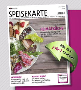 Das informative Magazin ist zu einem Preis von 8,90€ zu erhalten und bietet Freunden guter Küche einen umfassenden Überblick. Zudem liefert die Tip Speisekarte 2012 über tausend Adressen, Informationen über Neueröffnungen und kurze Beschreibungen zu den jeweiligen Etablissements, die ebenfalls für das iPhone erhältlich sind. Das beliebte Magazin ist informativ, unterhaltsam und hilfreich. Auf sympathische Weise werden Interviews geführt und ausführliche Artikel verfasst, die dem Leser viel wertvolle Tipps liefern und so auf den neusten Stand bringen. Die Tip Speisekarte 2012 ist auch am Kiosk, sowie Online erhältlich.