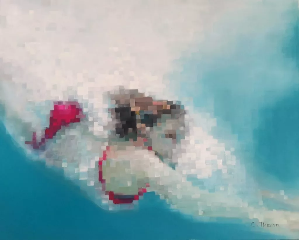 Cornè Theron zeigt in ihren Kunstwerken Menschen unter Wasser. Ihr Stil ist unverkennbar und geprägt durch den Einsatz von verschiedenen Glasformen als Filter, um eine besondere Abstraktion in Ihren Arbeiten zu erreichen. Theron nutzt dabei eine äußerst prägnante Pixeltechnik, die ihr im Laufe der Jahre eine große Fangemeinde eingebracht hat.