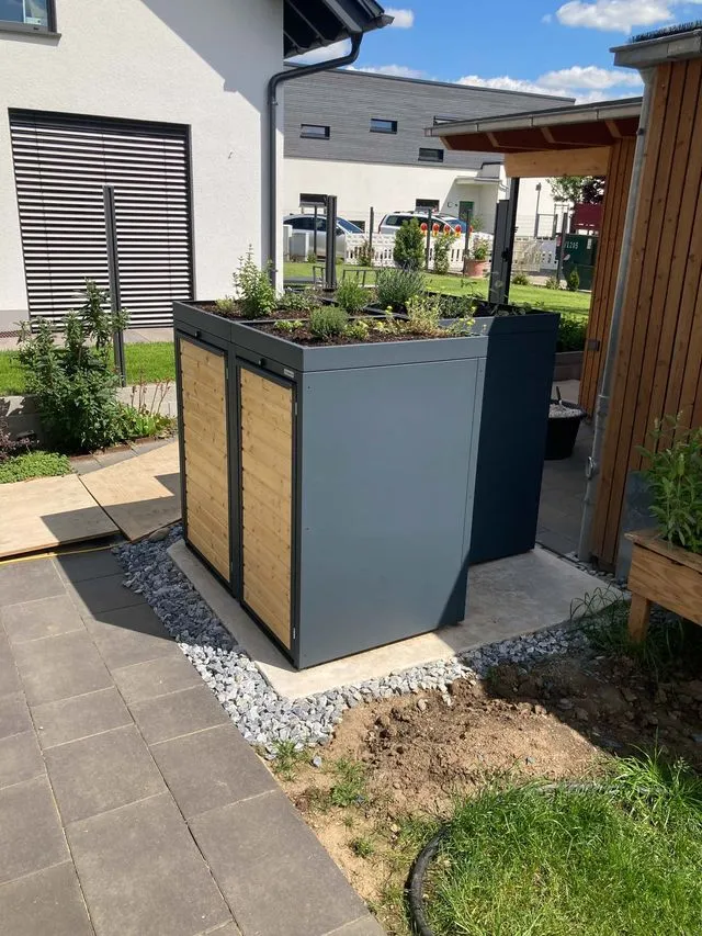 Das Pflanzdach bringt Natürlichkeit in einen Bereich, der sonst meist nur zweckmäßig gestaltet wird. Dadurch wirkt die Box nicht wie ein notwendiges Übel, sondern wie ein bewusst eingesetztes Designelement. Blumen, Gräser oder pflegeleichte Pflanzen schaffen Leben, Farbe und eine deutlich freundlichere Wirkung.