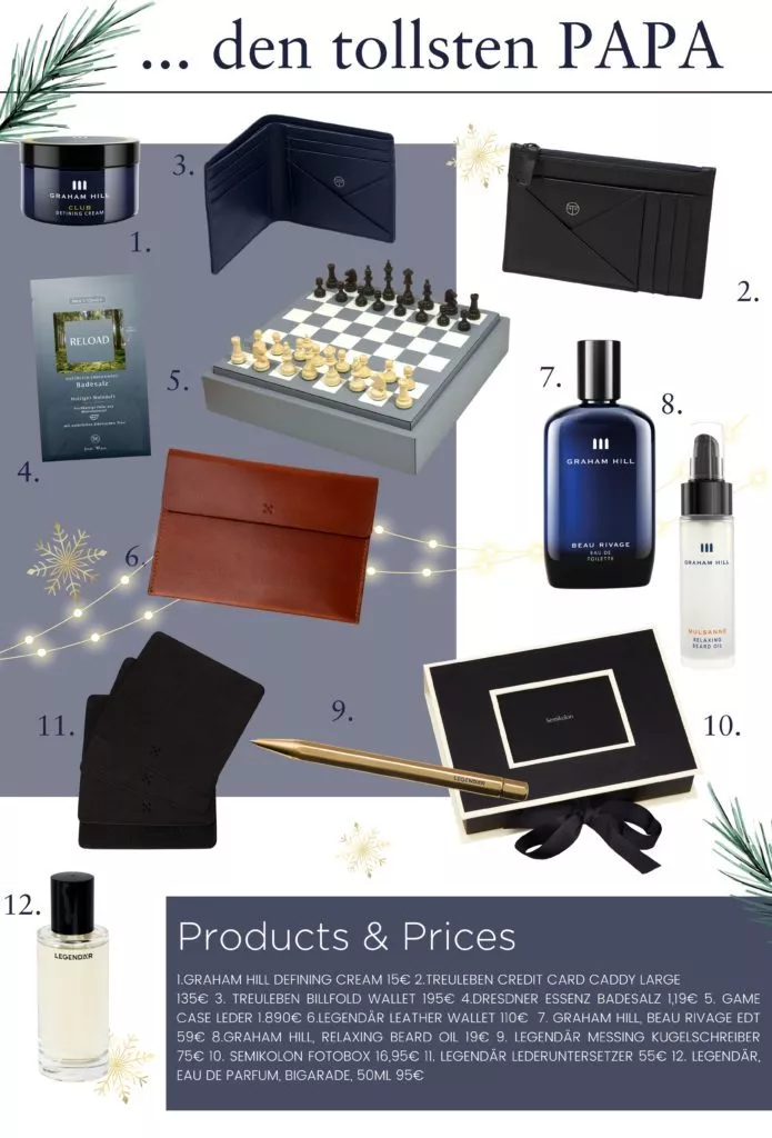 Weihnachtsgeschenke für die ganze Familie – auch Papas brauchen Entspannung: Feuchtigkeitscreme oder Badesalz erfreuen gestresste Väter. Leder-Accessoires oder ein stilvoller Kugelschreiber gehen immer.