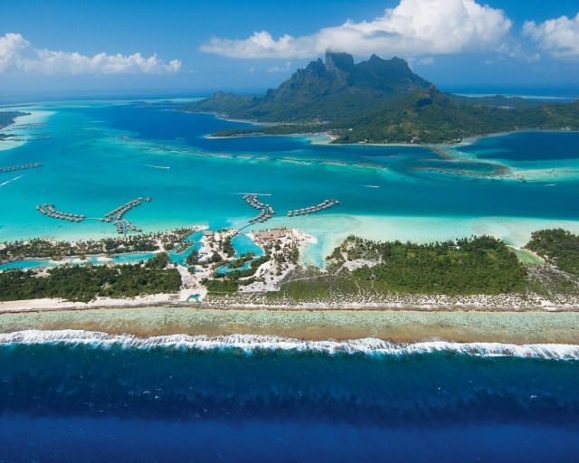 Das Four Seasons Resort Bora Bora in Französisch-Polynesien lädt ab 1.500 Euro pro Nacht ein. Das 5-Sterne Luxushotel liegt auf der Insel Motu Tehotu an der Lagune Bora Bora. Highlight: Der Blick auf das türkisglitzernde Meer und die imposante Aussicht auf den Mount Otemanu.