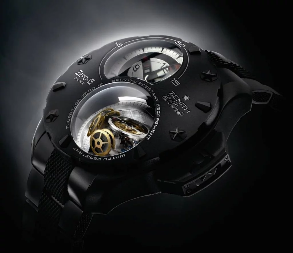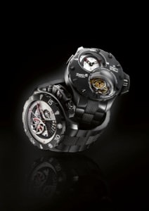 um die Stunden- und Minutenanzeige bei 11 Uhr und um die Öffnung des phänomenalen Tourbillons bei 5 Uhr. Ein mehrschichtiges Zifferblatt aus Hesalitglas, Karbonfaser und Aluminium unter zwei Saphirgläsern, ein geschwärztes Titangehäuse mit einer Wasserdichtigkeit bis 1.000 Meter, eine schwarze, kugelgestrahlte Lünette aus Titan, eine geschützte Krone, ein Heliumventil, ein Titan-Armband mit Einschüben aus Kevlar und Hochtemperaturbeständigkeit: Das sind die Merkmale, die diesen Zeitmesser zu einer Extremsportuhr machen. Ein neuer Stern am Zenit des Firmaments, erhältlich in nummerierter Jahrgangsauflage.
